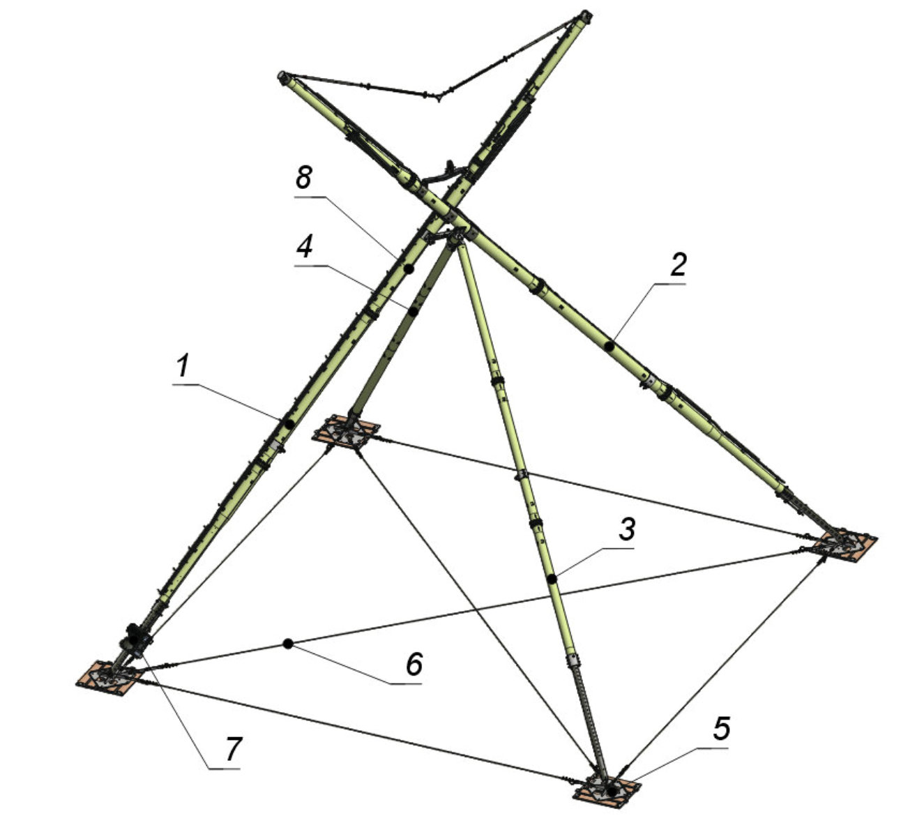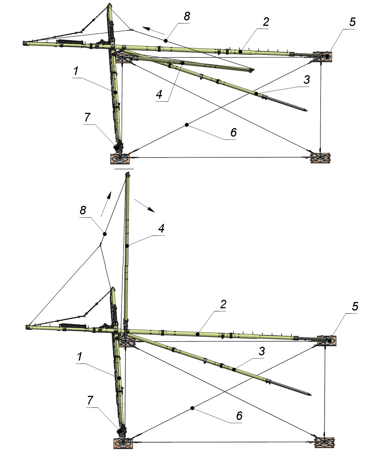 1 - Левая стойка; 2 - Правая стойка; 3 - Жесткий подкос; 4 - Ведущий подкос; 5 - Плита опорная; 6 - Связь; 7 - Лебедка; 8 - Канат подъёмный