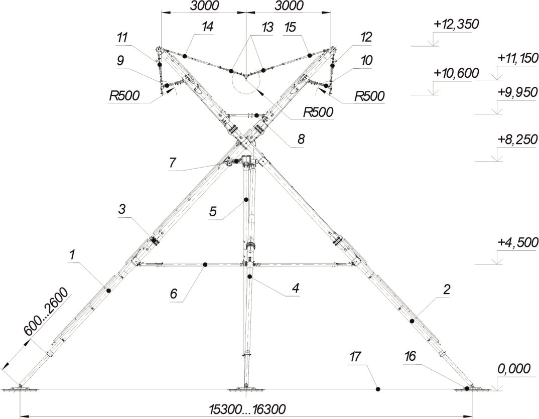 1 - Левая стойка; 2 - Правая стойка; 3 - Узел соединения секций; 4 - Жесткий подкос; 5 - Ведущий подкос; 6 - Пояс жестких связей; 7 - Балка; 8 - Мостик; 9,10 - Изолятор ОСК 3-35-А-2; 11, 12, 13 - Изолятор ЛК 120-35-И-3 СС; 14,15 - Талреп; 16 - Плита опорная; 17 - Связь